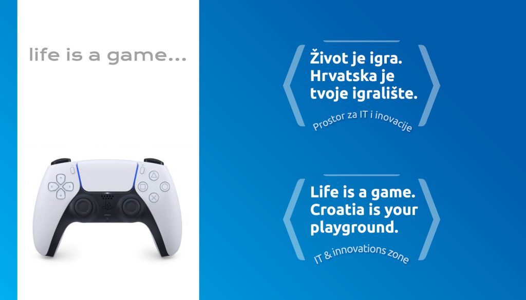 Slogan smo postavili unutar stiliziranog prikaza PlayStation konzole, dodatno naglašavajući temu konferencije te smo dodali i podslogan: “Prostor za IT i inovacije” kako bismo spriječili da se slogan veže isključivo uz gaming.